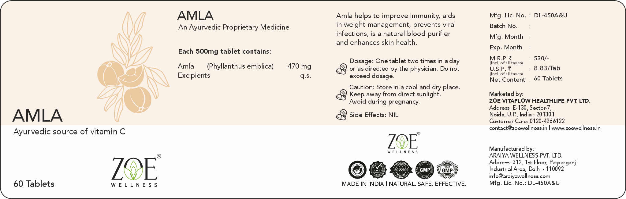 Ingredients: Each 500mg tablet contains:Amla